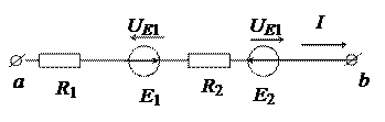 Данное соотношение называется законом Ома. При записи закона Ома для участка цепи с ЭДС учитывается направление ЭДС, напряжения и тока. Например, выражение для тока в ветви на рис. 1. запишется так: