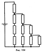 981. Определите падение напряжения на подводящих проводах и их сопротивление, если на зажимах лампочки, имеющей сопротивление 10 Ом, напряжение 1 В, ЭДС источника 1,25 В, его внутреннее сопротивление 0,4 Ом. 982. ЭДС сухого элемента 1,5 В. Ток короткого замыкания равен 30 А. Чему равно внутреннее сопротивление элемента? Каким будет напряжение на его полюсах, если замкнуть элемент на катушку сопротивлением 1 Ом? 983. Чему равно внутреннее сопротивление аккумуляторной батареи с ЭДС 6 В, если ток короткого замыкания равен 300 А? Каково напряжение на зажимах этой батареи, если она в стартере автомобиля сопротивлением 0,04 Ом дает силу тока 100 А? 984. Электрическая схема составлена из двух параллельно соединенных резисторов сопротивлением 40 Ом и 10 Ом и подключенных к зажимам аккумулятора, ЭДС которого 10 В. Сила тока в общей части цепи равна 1 А. Найдите внутреннее сопротивление аккумулятора и ток короткого замыкания. 985. Динамомашина питает током 100 ламп, соединенных параллельно и имеющих сопротивление 1200 Ом каждая. Лампа рассчитана на напряжение 220 В. Сопротивление линии 4 Ом. Внутреннее сопротивление машины 0,8 Ом. Найдите ЭДС машины и напряжение на ее зажимах. 986. К полюсам батареи с ЭДС 120 В и внутренним сопротивлением 10 Ом подключены два параллельных провода сопротивлением 20 Ом каждый. Свободные концы проводов и их середины соединены друг с другом через две лампочки сопротивлением 200 Ом. Найдите силу тока, текущего через батарею.