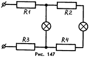 965. К источнику тока напряжением 12 В присоединена линия, питающая две лампы. Схема включения ламп показана на рисунке 147. Сопротивление участков линии R1 = R2 = R3 = R4 = R = 1,5 Ом. Сопротивление каждой лампы 36 Ом. Определите падение напряжения на каждой лампе.