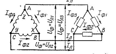 Кроме соединения звездой, генераторы, трансформаторы, двигатели и другие потребители трехфазного тока могут включаться треугольником. На рисунке представлена несвязанная трехфазная система. Объединяя попарно провода несвязанной шестипроводной системы и соединяя фазы так, как указано на чертеже, переходим к трехфазной трехпроводной системе, соединенной треугольником.