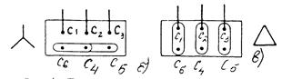 Рис б: соединение обмоток “звездой”; в: соединение обмоток “треугольником”.