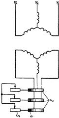 “звезда” “треугольник” … “звезда” “треугольник” Статорные обмотки сдвинуты одна относительно другой на 120º. Поэтому результирующее магнитное поле образованное тремя фазами является вращающимся и его скорость определяется по формуле: n1=60f/p где: n1 - скорость магнитного поля статора; f – частота питающей сети (50 Гц); p – число пар полюсов. В зависимости от типа роторной обмотки машина может быть с фазным и короткозамкнутым ротором. Фазная обмотка ротора выполнена подобно статорной, т. е. проводники обмотки ротора соответствующим образом соединены между собой, образуя трехфазную систему. Эти обмотки соединены в звезду или в треугольник, причем начало каждой фазы звездной обмотки или же точки соединения начала и конца соседних фаз треугольной обмотки приключены к трем контактным медным кольцам. Эти контактные кольца изолированы друг от друга, укреплены на валу двигателя и вращаются вместе с ротором. При вращении колец поверхности их скользят по угольным или медным щеткам, неподвижно укрепленным над кольцами. Обмотка ротора может быть замкнута на какое-либо сопротивление или накоротко при посредстве указанных выше щеток.