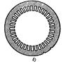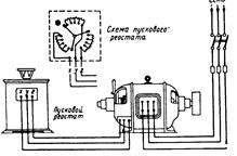 Сердечник статора 7 запрессовывают в литую станину 6 и укрепляют в ней стопорными винтами. Сердечник ротора 9 напрессовывают на вал ротора который вращается в шариковых или роликовых подшипниках, установленных в двух подшипниковых щитах 2 и 12. Воздушный зазор между статором и ротором стремятся сделать минимально возможным. Обмотка статора. Обмотка статора выполняется из проводников круглого или прямоугольного сечения. Проводники, находящиеся в пазах, соединяются между собой, образуя ряд катушек. Все катушки расчленяются на одинаковые группы по числу фаз, которые располагаются симметрично вдоль окружности статора или ротора. В каждой такой группе все катушки электрически соединяются между собой, образуя одну фазу обмотки, т. е. отдельную электрическую цепь. При больших значениях фазового тока или при необходимости переключения отдельных катушек фазы могут иметь несколько параллельных ветвей. Простейшим элементом обмотки является виток, состоящий из двух проводников, размещенных в пазах, находящихся друг от друга на некотором расстоянии. Обычно витки, образованные проводниками, лежащими в одних и тех же пазах, объединяются в одну или две пазовые катушки. Иногда их называют секциями. Они укладываются таким образом, что в каждом пазу размещается одна сторона катушки или две стороны - одна над другой. В соответствии с этим различают однослойные и двухслойные обмотки. Фазы обмотки статора всегда сдвинуты одна относительно другой на 120 электрических градусов независимо от того, сколько полюсов в машине, т. е. на какой геометрический угол они в действительности сдвинуты между собой. частями обмотки. (ярусах). Отдельные фазы обмотки статора могут соединяться в звезду или треугольник. Для этой цели начала и концы обмоток каждой фазы выводят к шести зажимам клеммной коробки двигателя. Обмотка ротора. В двигателях с фазным ротором обмотку ротора выполняют, так же как и обмотку статора, в виде системы из нескольких катушек, объединенных в три фазы. Последние сдвинуты одна относительно другой на 120 электрических градусов. Число полюсов обмотки статора и ротора берется одинаковым. Обмотку фазного ротора обычно соединяют в звезду. Концы ее присоединяют к трем контактным кольцам, к которым посредством щеток подключают трехфазный пусковой реостат (рис. 1), т.е. в каждую фазу ротора в момент пуска вводят дополнительное активное сопротивление. Для уменьшения износа контактных колец и щеток двигатели с фазовым ротором иногда снабжают приспособлениями для подъема щеток и замыкания колец накоротко после выключения реостата.
