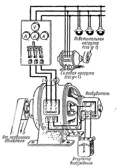 На рисунке 5 дана наглядная схема синхронного генератора с возбудителем, питающим силовую и осветительную нагрузки, а на рис. 6 электрическая схема.