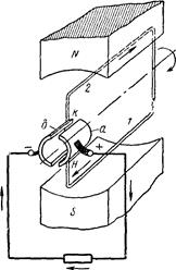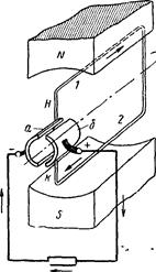 При вращении якоря в магнитном поле полюсов в проводниках его обмотки индуктируется э. д. с., переменная по величине и направлению. Если концы одного витка припая гь к двум медным кольцам, на кольца наложить щетки, соединенные с внешней сетью, то при вращении витка в магнитном поле, как показано на рис.1, в замкнутой цепи потечет переменный электрический ток. Если же концы витка присоединить к двум медным полукольцам а и б, изолированным друг от друга и называемым пластинами коллектора, и наложить на них щетки, то при вращении витка в магнитном поле, как показано на рис. 2, в витке будет по-прежнему индуктироваться переменная э. д. с. Однако во внешней цепи будет протекать изменяющийся по величине ток постоянного направления (пульсирующий ток). Для уяснения этого обратимся к рис. 2. Начало витка Н припаяно к коллекторной пластине а, конец витка К к пластине б. К коллекторным пластинам прижаты две неподвижные щетки, соединенные с внешней сетью.