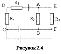 Первое из этих правил выражает закон сохранения электрического заряда; второе является следствием закона Ома. Узлом электрической цепи называют точку, в которой соединяются не менее трёх проводников (А, В, С, F). Контуром в электрической цепи называют замкнутую последовательно соединенную часть цепи, например, АВСD. 1. В каждой точке разветвления цепи (узле) алгебраическая сумма сил токов равна нулю: