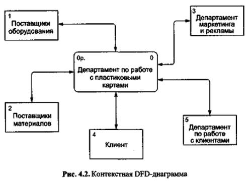 Синтаксис и семантика диаграмм потоков данных В отличие от IDEFO, рассматривающего систему как множество взаимопересекающихся действий, в названиях объектов DFD-диаграмм преобладают имена существительные. Контекстная DFD-диаграмма часто состоит из одного функционального блока и нескольких внешних сущностей. Функциональный блок на этой диаграмме обычно имеет имя, совпадающее с именем всей системы (рис. 4.2). Добавление на диаграмму внешних ссылок не изменяет фундаментального требования, что модель должна строиться с единственной точки зрения и иметь четко определенные цель и границы, что уже обсуждалось ранее.