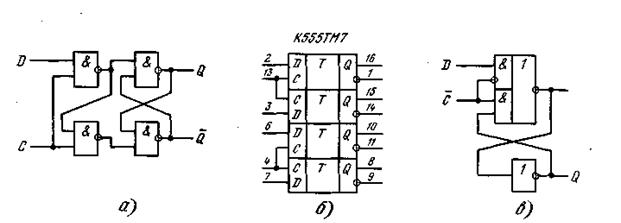 Рисунок 3 – D – триггер: а – функциональная схема, б – УГО микросхемы К555ТМ7, в – триггер-«защелка»