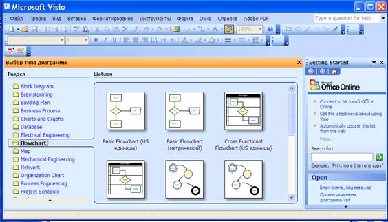 Окно программы состоит из двух частей: слева - окно Выбор типа диаграммы (Choose Drawing Type), справа - панель задач Приступая к работе (Getting Started). В списке Раздел перечислены все типы диаграмм. Построение Блок-схем Блок-схемы являются идеальными диаграммами для визуального представления алгоритма вычислительного процесса. Шаблоны блок-схем ü Для построения блок-схемы в выделенном разделе Flowchart необходимо выбрать шаблон Basic Flowchart Shapes При создании нового документа открывается окно Visio, которое содержит меню и панели инструментов, окно Формы, страницу документа, область вставки и линейки окна документа. 2.2.Окно нового документа: