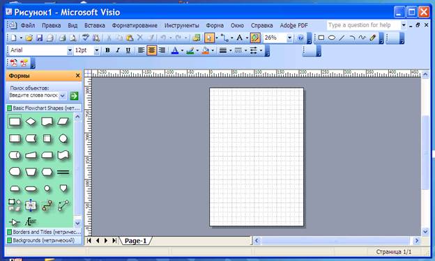 Трафарет, который содержит нужные фигуры, расположен в окне Формы слева от страницы документа. Страница документа Visio отображается в виде бумажной страницы с нанесенной на нее сеткой, которая облегчает размещение фигур.