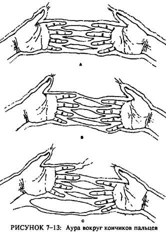 Энергия почти всегда движется по кругу слева направо. Остановка ее вызывает неприятное ощущение, да и полная остановка потока обычно невозможна. Помещая что-либо между рук, вы ощущаете покалывание и напряжение, словно при воздействии статического электричества. Ощущение покалывания и напряжения возникает при соприкосновении краев энергетического поля. Очерчивая над ладонью круг, вы можете ощутить покалывание по его контуру. Многие люди при попытке воспринять ауру видят вокруг пальцев и рук дымку, которая напоминает пары жара над радиатором. Иногда она видится в различных цветах, например, с синим оттенком. Обычно вначале большинство людей видят ее бесцветной. Когда дымка кончика пальца одной руки соединяется с дымкой кончика пальца другой руки, энергетические тела растягиваются между пальцами, словно тянучки. Когда вы перемещаете пальцы, дымка вначале тянется к предыдущему пальцу, а затем переходит на следующий (рис. 7-13).