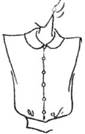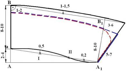 Строят прямой угол с вершиной А, стороны которого направлены вправо (по горизонтали) и вверх. Линия середины — вертикальная сторона угла. Линия втачивания. От точки А по горизонтальной стороне угла откладывают отрезок, равный мерке полуобхвата шеи плюс 0,5 см,— длину воротника и ставят точку А 1 А А, = ПОш + 0,5 = 18 + 0,5 = =18,5 см (Длину воротника можно измерять по линии горловины от середины спинки до середины переда после примерки изделия). От точки А по линии середины откладывают 2 — 4 см и ставят точку а: Аа= 2 - 4 см Точки а и А 1 соединяют вспомогательной прямой, которую затем делят на 3 части. Точки деления обозначают I и II. Из точки I восстанавливают вверх перпендикуляр и откладывают на нем 0,5 см. Из середины отрезка между точками А 1 и II проводят вниз перпендикуляр, на котором откладывают 0,2 см. Точки А 1, 0,2 см, II, 0,5 см и а соединяют плавной кривой. Отлетный срез. От точки а вверх по линии середины откладывают 8 — 10 см — ширину воротника сзади. Столько же откладывают на перпендикуляре, восстановленном вверх из точки А, на отрезке а А 1; ставят соответственно точки В и В 1. аВ = А 1 В 1 = 8-10 см Точки В и В1 соединяют вспомогательной прямой, которую продолжают вправо на 3 -6 см (величина выступа угла). Из середины отрезка ВВ1 восстанавливают вверх перпендикуляр, на котором откладывают 1 — 1,5 см. Плавной кривой, выходящей из точки В под прямым углом к отрезку АВ, соединяют точки В, 1-1,5 см и 3-6 см. Точки А 1 и 3-6 см соединяют под линейку.