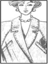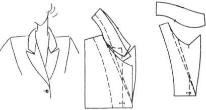 При построении выкроек воротников пиджачного типа на выкройке-основе определяют положение линии раскепа, т. е. линию втачивания воротника в горловину на отложной части борта. Положение этой линии определяется модой и желанием автора изделия. Верхняя часть этой линии проходит по горловине полочки, а затем проводится одновременно с линией уступа лацкана. Обрисовав лацкан, в зависимости от положения его уступа проводят линии уступа и отлета воротника. Выкройку воротника отрезают от выкройки полочки по линии раскепа.