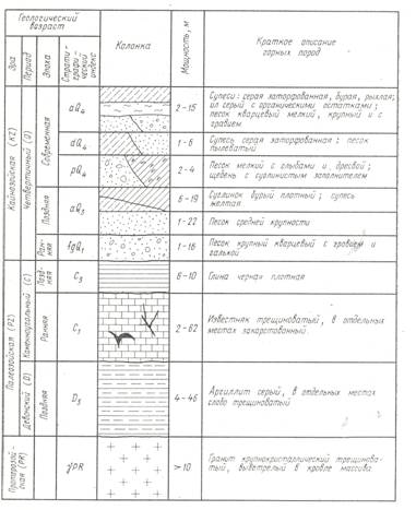 Скважина № 1 (143,8 м абс. выс.) 1. Почвенный слой — 0—0,6 м. 2. Суглинок бурый, иловатый — 0,6—2 м 3. Песок желтый, мелкозернистый — 2—6,5 м. 4. Песок желтый, серый, ржаво-бурый, разнозернистый — 6,5— 7,5 м. 5. Гравий и мелкая галька — 7,5—8,5 м. 6. Известняк серый, крупноплитчатый, с прослоями глин — 8,5— 11 м. Скважина № 2 (149,2 м абс. выс.) 1.Почвенный слой 0—0,2 м. 2. Песок желтый, разнозернистый, с прослоями глин и гравия — 0,2—11 м 3. Известняк серый, крупноплитчатый, с прослоями глин—11— 13 м. Скважина № 3 (163 м абс. выс.) 1. Почвенный слой — 0—0,2 м. 2. Песок желтый, мелкозернистый, с косой слоистостью и тонкими прослойками глин — 0,2—2,5 м. 3. Песок разнозернистый, с косыми прослойками — 2,5—6,5 м. 4. Грубые пески с галькой, косослоистые — 6,5—8,5 м. 5. Известняк серый, крупноплитчатый — 8,5—11 м. Скважина № 4 (193,2 м абс. выс.) 1. Почвенный слой — 0—0,2 м. 2. Суглинок бурый, безвалунный — 0,2—2 м. 3. Красно-бурый суглинок с валунами — 2—17 м. 4. Песок желтовато-серый, разнозернистый — 17—20 м. 5. Глины темные, жирные, сланцеватые — 20—22 м. 6. Известняк серый, крупноплитчатый — 22—25 м. Примечание: 1. При построении разреза используйте горизонтальный масштаб 1:25000, вертикальный 1:2000. 2. Условные знаки для обозначения пород на профиле подбираются каждым студентом самостоятельно.