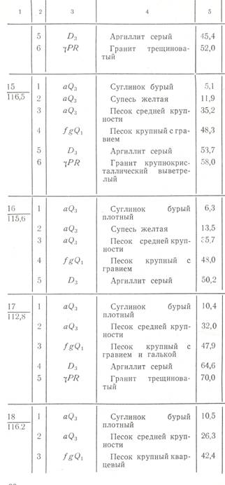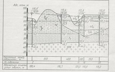 Рис.113. Геологический разрез по линии V-V(на рис. 111) Строить разрез рекомендуется на миллиметровой бумаге в следующем порядке. В нижней части листа делают три графы для характеристики скважин и указания расстояний между ними. Намечают начало и длину разреза в принятом масштабе. У начала разреза (а иногда и в конце его) строят шкалу абсолютных отметок с таким расчетом, чтобы максимальная отметка была несколько выше верхней точки рельефа, а минимальная - ниже забоя самой глубокой скважины. Далее приступают к построению топографического профиля, как мы это делали и раньше. Откладывают в заданном масштабе расстояния от начала разреза до его пересечения с каждой горизонталью и точками отмечают абсолютные отметки соответствующих горизонталей. После этого откладывают от начала разреза расстояния до каждой скважины и проводят вертикальный штрих в верхней графе. Под штрихами указывают номера скважин, а ниже — абсолютные отметки их устьев, которые дают дополнительные точки для построения профиля. Соединив все точки плавными линиями, получают топографический профиль поверхности земли по заданному направлению. На построенный профиль наносят колонки буровых скважин. При крупном масштабе разреза ствол скважины обозначают двумя вертикальными отрезками, в остальных случаях — одним. На нижнем конце отрезка, соответствующем абсолютной отметке низшей точки пробуренной скважины (забою), ставят короткий поперечный штрих. Справа от штриха записывают абсолютную отметку забоя, вычисляемую как разность между абсолютной отметкой устья и глубиной скважины. Например, для скважины 2: 106,4—65,0=41,4 м. Вдоль линии скважины размечают границы слоев и проставляют их абсолютные отметки, которые вычисляют как разность абсолютной отметки устья скважины и глубин залегания соответствующих слоев. Например, в скважине 2 абсолютная отметка границы между четвертым и пятым слоями равна: 106,4—34,9 = 71,5м. В интервале каждого слоя (на полосе шириной 1... 2 см) условными обозначениями, взятыми из стратиграфической колонки, отмечают карандашом состав и относительный возраст пород. Далее на топографический профиль переносят с карты точки пересечения разреза со стратиграфическими границами и карандашом справа и слева от точек отмечают относительный возраст пород. Например, левее скважины 6 на профиле отмечают границу между нижнекаменноугольными известняками (C1) и верхнечетвертичными отложениями (Q 3). Прежде чем проводить границы слоев на разрезе, восстанавливают в общих чертах доступную нам историю геологического развития изучаемого участка. Рассматривая стратиграфическую колонку и колонки скважин на разрезе, видим, что наиболее древними породами, вскрытыми скважинами, являются протерозойские граниты. Между ними и залегающими выше верхнедевонскими аргиллитами имеется стратиграфический перерыв, во время которого происходило разрушение гранитов, и формировался рельеф, поверхность которого могла иметь сложную форму. Это подтверждается тем, что кровля гранитов в скважинах 2, 6, 11, 20, попавших в разрез, вскрыта на разных абсолютных отметках (47,7; 51,5; 52,8; 53,8 м). На верхнедевонских аргиллитах без стратиграфического перерыва залегают нижнекаменноугольные известняки. Граница между ними является почти горизонтальной. В послекаменноугольное время вплоть до начала четве