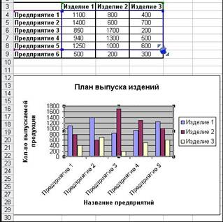 Добавим новые данные к диаграмме, представленной на рисунке 9. Для этого следует: ü Активизировать область построения диаграммы. Синяя и фиолетовая рамки вокруг диапазона А3:D8 покажет область исходных данных. ü «Ухватить» мышью синий маркер рамки и расширить область, которая этой рамкой охватывается, т. е. до А3: D9. Диаграмма будет изменена, и в ней появятся данные о плане выпуска продукции предприятием Предпр. 6 (рис. 11).