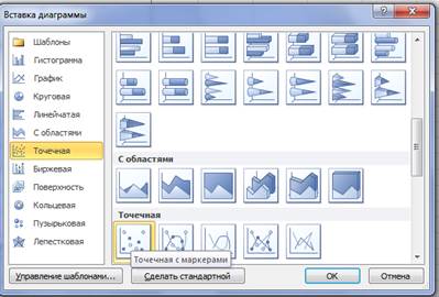 В первом случае была выбрана точечная диаграмма, вид которой выделен и показан на рисунке 18, во втором случае – на рисунке 20. В точечной диаграмме каждая точка строится с использованием пары координат: одна – из ряда X, а другая – из ряда Y. При этом ряд значений X должен содержаться в левом столбце (или верхней строке), интервала данных, а ряды значений в последующих столбцах (или строках).