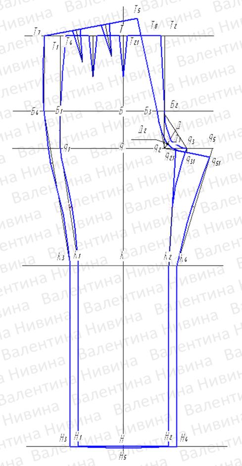 Линия среднего среза. Вспомогательные точки: Д1Д2=Д1Я2: 2 Баланс брюк — это соотношение уровней вершин среза передней и задней половинок. ТТ21=ТТ2: 3 От точки T вправо отложить 1/3 длины отрезка ТТ2 и поставить точку Т21. Из точки Т21 вверх провести вертикаль, на ней отложить 4,3 см и поставить точку Т5: Т21Т5 = 0,1 х (ПОБ + Пб) - 1 = 0,1 х (52 + 1)- 1 =4,3 см.