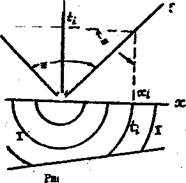 Для построения изохрон студентам предлагается двухслойная среда с постоянными скоростями распространения сейсмических волн в каждом слое. Слои разделены наклонной границей, являющейся отражающей и преломляющей одновременно. Исходные данные: а/ скорость в верхнем слое /выше границы/ V1 =2000 м/с; б/ скорость в нижнем слое V2 =3000 м/с; в/ временной интервал между изохронами dT =0,1 с; г/ масштаб расстояний /глубин/ - 1: 20 000, т.е. в 1см - 200 м; д/ масштаб времени для годографов (по оси времен годографа в 1 см - 0,1 с). Глубина границы по вертикали и угол наклона задается преподавателем. Для выполнения работы требуется циркуль, линейка и карандаш. Построение выполняется на листе формата А3 или двух А4 (на одном - поле времен для модели среды, второй – для сейсмограммы).