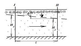 где Н 1 и Н 2 – разности отметок гидроизогипс (или мощности водоносного пласта), м; l – расстояние между гидроизогипсами по нормали, м.