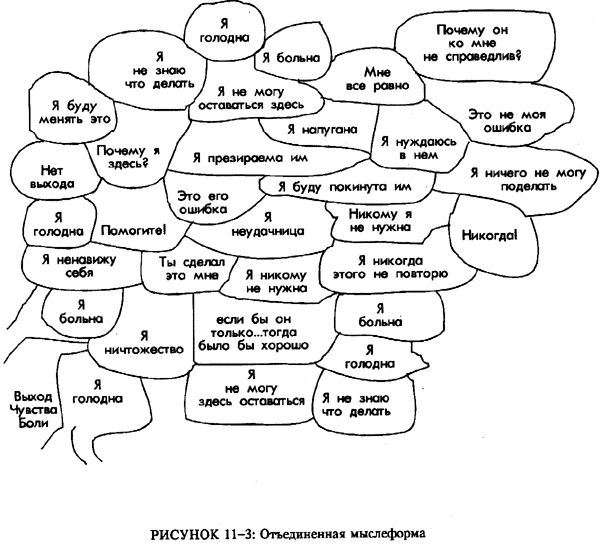 На рис. 11-3 показан такой пример. В этом конкретном случае, когда я обрисовала формы, пациентка видела общую картину. Это хорошее понимание помогло ей центрироваться и высвободиться из хронического цикла. Она входила в состояние гнева, выражала его и затем наблюдала проявление глубоких последствий. На внешнем уровне эта конкретная мыслеформа по большей части является маской, под которой человек не видит или не принимает на себя ответственности, но обвиняет других. Она делала это, чтобы выглядеть «хорошей». Конечно, из-за этого она оставалась бессильной до тех пор, пока не была достигнута более глубокая реальность, которая является сердцевиной той мыслеформы. Когда из-за травмы, полученной в детстве, она ощутила себя внутренне «плохой» и ничего не могла с этим поделать, моя пациентка поняла, что в будущем у нее есть выбор — увидеть и осознать всю структуру, сначала входя в гнев через ощущение ловушки, а затем в скрывающуюся в той мыслеформе боль. Она обычно избегала этой боли, оставаясь на поверхности мыслеформы /и следовательно, в неререальности/. Переживая боль, она сумела соединить ребенка, которым была внутри и который знал, что это не так. Как правило, проявление и высвобождение чувств является ключом для разрушения шаблона циклической мысли. Большую часть времени эти формы прежде всего разобщаются, чтобы человек не испытал чувств, заключенных в них. Индивидуум в своей повседневной жизни затрачивает много усилий, пытаясь избежать движения мыслеформ, потому что оно может пробудить нежелательные чувства. Даже если человек избегает соответствующих ситуаций, это еще не решает дела, так как он постоянно перезаряжает мыслеформы. В ходе индивидуального терапевтического процесса форма все теснее связывается с остальной личностью; негативные аспекты преобразуются в позитивные функции и соединяются с «нормальной» аурой человека в виде бесформенных ярких чистых цветовых сгустков.