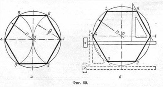 Построение вписанного в окружность правильного шестиугольника. Построение шестиугольника основано на том, что сторона его равна радиусу описанной окружности. Поэтому для построения достаточно разделить окружность на шесть равных частей и соединить найденные точки между собой (фиг. 60, а).