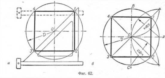 1—2 достаточно построить по точке 1 и стороне 0—1 угол в 30°. Для этого устанавливаем рейсшину и угольник так, как это показано на фигуре, проводим линию 1—2, которая будет одной из сторон искомого треугольника. Чтобы построить сторону 2—3, устанавливаем рейсшину в положение, показанное штриховыми линиями, и через точку 2 проводим прямую, которая определит третью вершину треугольника. Второй способ основан на том, что, если построить правильный шестиугольник, вписанный в окружность, и затем соединить его вершины через одну, то получится равносторонний треугольник. Для построения треугольника (фиг. 61, б) намечаем на диаметре вершину—точку 1 и проводим диаметральную линию 1—4. Далее из точки 4 радиусом, равным D/2, описываем дугу до пересечения с окружностью в точках 3 и 2. Полученные точки будут двумя другими вершинами искомого треугольника. Построение квадрата, вписанного в окружность. Это построение можно выполнить при помощи угольника и циркуля. Первый способ основан на том, что диагонали квадрата пересекаются в центре описанного круга и наклонены к его осям под углом 45°. Исходя из этого, устанавливаем рейсшину и угольник с углами 45° так, как это показано на фиг. 62, а, и отмечаем точки 1 и 3. Далее через эти точки проводим при помощи рейсшины горизонтальные стороны квадрата 4—1 и 3—2. Затем с помощью рейсшины по катету угольника проводим вертикальные стороны квадрата 1—2 и 4—3. Второй способ основан на том, что вершины квадрата делят пополам дуги окружности, заключённые между концами диаметра (фиг. 62, б). Намечаем на концах двух взаимно перпендикулярных диаметров точки А, В и С и из них радиусом у описываем дуги до взаимного их пересечения. Далее через точки пересечения дуг проводим вспомогательные прямые, отмеченные на фигуре сплошными линиями. Точки их пересечения с окружностью определят вершины 1 и 3; 4 и 2. Полученные таким образом вершины искомого квадрата соединяем последовательно между собою.