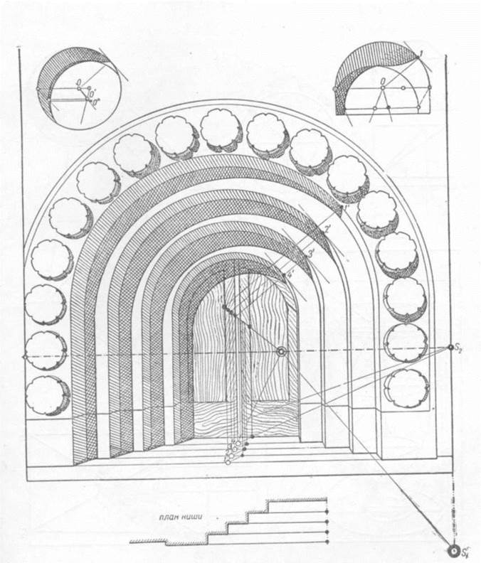 Рис. 119. Тени: собственная и падающая в сводчатом помещении в) метод параллельных падающих теней, основанный на ранее описанном нами свойстве плоских фигур отбрасывать тень, подобную или равную по форме самой фигуре, при условии параллельности фигуры той плоскости, на которую падает тень; такой прием значительно упрощает построение сложной тени, падающей от шара, вазы и других предметов, сложных по форме; вместе с тем этот способ позволяет определить и форму собственной тени на таких предметах (рис. 120—122).