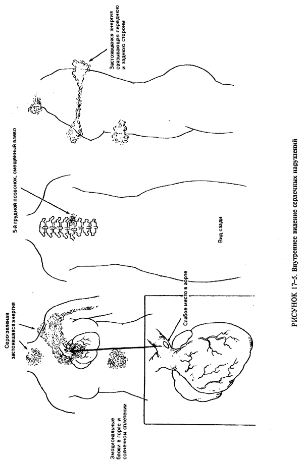 Случай предвидения, или предостережения со стороны духовных учителей, произошел однажды, когда я пошла навестить подругу. Я была в трех кварталах от ее офиса, когда мне было сказано, что ее там не будет, что она, возможно, получила сердечный приступ и что мне необходимо излечить ее. Я нашла ее офис запертым, пошла к ней домой, где и нашла ее в состоянии физического страдания, прижимающей левую руку к телу. Утро она провела в комнате экстренной помощи, делая кардиограммы. На рис. 17-5 показано то, что открылось моему видению. В области горла и солнечного сплетения скопилась эмоциональная боль и страх, в области сердца находилась застоявшаяся энергия, которая распространялась по телу и возвращалась обратно через задний аспект сердечной чакры. Грудной позвонок был смещен влево. Этот позвонок не связан с нервами, проходящими через сердце, но он расположен в корне сердечной чакры. Также я могла видеть слабость в аорте прямо над сердцем. Когда мы вместе работали над очищением застоявшейся вокруг сердца энергии, моя подруга освободила эмоциональный зажим в области горла и солнечного сплетения, поделившись своей болью со мной и выплакавшись. Темная энергия очистилась, грудной позвонок вернулся на свое место. Она почувствовала себя намного лучше. Когда я уходила, слабость в ауре еще была, но со временем она заметно очистилась. Микроскопическое внутреннее видение