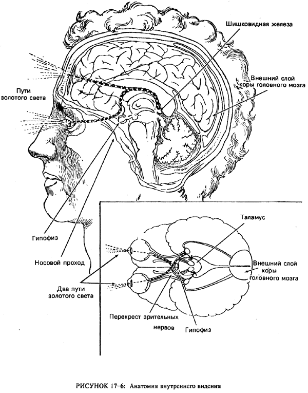 Внутреннее видение представляет в человеке аналог рентгеновского луча или процесса ядерно-магнетического резонанса /ЯМР/, и оно столь же прикладное. Внутреннее видение заключается в способности смотреть сквозь тело на любую желаемую глубину и расстояние /в определенных границах/. Это новый способ восприятия вещей. Если я хочу увидеть орган, я сосредоточиваюсь на нем. Если я хочу заглянуть внутрь органа или в какую-то его часть, я сосредоточиваюсь на ней. Если я хочу увидеть микроорганизм, вторгшийся в тело, я сосредоточиваюсь на нем. Я воспринимаю это как обычные изображения. Например, здоровая печень представляется темно-красной, как и в случае с обычным видением. Если печень поражена желтухой, она будет окрашена в болезненный желто-коричневый цвет. Если человек подвергался или подвергается химиотерапии, его печень обычно выглядит зелено-коричневой. Микроорганизмы представляются примерно такими, как и под микроскопом. Мои опыты внутреннего наблюдения, которые случались спонтанно, позже стали более контролируемыми. Я начала понимать — для того, чтобы иметь такое видение, мне необходимо пребывать в особом открытом состоянии, в котором третий глаз /шестая чакра/ активизирован, а остальная часть моего ума находится в спокойном, сосредоточенном состоянии. Позже я обнаружила техники, вводящие в это состояние, и получила возможность смотреть внутрь тела, когда захочу этого, при условии, что способна войти в то ментальное и эмоциональное состояние. Будучи уставшей, я не всегда могла сделать это, отчасти из-за того, что усталому труднее сосредоточить и успокоить ум, а также повысить вибрационную частоту. Я обнаружила, что мало значило, были мои глаза открыты или закрыты, разве что через открытые глаза могли поступать помехи или дополнительная информация. Иногда эта дополнительная информация помогала сосредоточению, а иногда препятствовала ему. Например, иногда глаза мне помогают сосредоточить ум на том, куда я смотрю. В другое время я закрываю глаза, стараясь не допустить постороннюю информацию, которая может отвлечь мое внимание. Примеры внутреннего видения