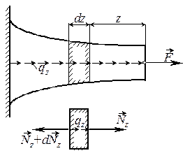 Выделим из стержня, нагруженного распределенной осевой нагрузкой интенсивности qz (рис. 1.2), бесконечно малый элемент dz и составим для него уравнение равновесия в проекции на ось z: å Zi = 0, Nz + dNz - Nz - qzdz = 0, откуда Интегрируя это выражение, получим