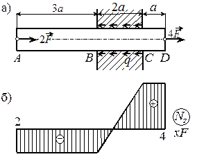 откуда q = 3 F / a. Эпюру Nz строим по формуле Nz = No ± qz. Согласно этой зависимости на участках АВ и CD продольная сила постоянна, так как погонной нагрузки нет (q = 0). На участке ВС продольная сила изменяется по линейному закону (q = const). В сечениях А и D, где приложены сосредоточенные силы, на эпюре Nz имеют место скачки, равные по величине приложенным силам. Примем направление обхода слева направо. В сечении А сила 2 F вызывает сжатие, поэтому NAB = -2 F. На участке ВС продольная сила изменяется от NB = NA = -2 F до NС = NВ + q ×2 a = 4 F. На участке CD продольная сила постоянна и равна NСD = 4 F.