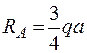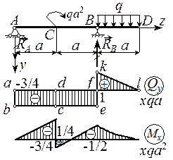 å mА = 0, RВ ×2 a - qa2 - qa ×5 a /2 = 0, откуда RB = (7/4) qa. Проверка: å y = 0, RA - RB + qa = 3 qa /4 - 7 qa /4 + qa º 0. 2. Построение эпюр поперечной силы и изгибающего момента. Э п ю р а Qy. В сечении А происходит скачок вниз на величину реакции RA и QA = - RA. На всем протяжении участков АС и СВ распределенная нагрузка отсутствует (q = 0), поэтому эпюра Qy представляется отрезком прямой, параллельной оси абсцисс. Наличие пары сил на эпюре Qy не отражается. В сечении В происходит скачок вверх, равный по величине приложенной реакции RB, и правее этого сечения имеем QBD = QBC + RB = -3 qa /4 + 7 qa /4 = qa. На участке BD поперечная сила изменяется по линейному закону (Qy = Qo - qz) от Qo = QBD = qa до QD = QBD - qa = 0. По условию загружения балки в сечении D нет сосредоточенной силы, поэтому QD = 0. Совпадение значений QD, полученных независимо друг от друга, служит проверкой правильности построения эпюры Qy. Э п ю р а Мх. Она строится по формуле Мх = Мо + w Q. На опоре А нет пары сил, поэтому МА = 0. На участке АС момент изменяется по линейному закону. Находим момент в сечении, бесконечно близком слева от точки С: МСА = Мо + w abcd = -(3/4) qa × a = -3 qa 2/4. По двум точкам (А и С) строим наклонную прямую. Пара сил, приложенная в сечении С, вызывает растяжение нижних волокон балки при движении слева направо, поэтому на эпюре Мх скачок вниз и в бесконечно близком сечении справа от точки С изгибающий момент равен: MCB = MCA + qa 2 = qa 2/4. Находим момент в сечении В: MB = MCB + w dcef = qa 2/4 - 3 qa 2/4 = - qa 2/2 и по двум точкам строим наклонную прямую. На участке BD момент изменяется по квадратичному закону, достигая в сечении D значения, равного MD = MB + w fkl = - qa 2/2 + (1/2) qa × a = 0. С другой стороны, по условию загружения балки на свободном конце MD = 0. Совпадение результатов служит проверкой правильности построения эпюры Мх. По двум точкам (В и D) приближенно строим параболу, обращенную выпуклостью вниз (в направлении нагрузки q). Вершина параболы совпадает с точкой D, так как QD = 0.