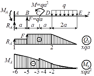 откуда MA = 6 qa 2; å Yi = 0, RA = q ×2 a - F = qa. 2. Построение эпюр поперечной силы и изгибающего момента. Э п ю р а Qy. В сечении А имеем QA = RA (скачок на величину и в направлении реакции RA = qa). На участке АВ погонной нагрузки нет, поэтому поперечная сила постоянна. В сечении В поперечная сила меняется скачком от QBA = QA = qa до QBC = QBA + F = 2 qa (скачок на величину и в направлении силы F = qa). На участках ВС и CD поперечная сила опять сохраняет постоянное значение, т.е. QBC = QCD = 2 qa. На участке DE поперечная сила изменяется по линейному закону от QD = 2 qa до QE = QD - q ×2 a = 0. Э п ю р а Мх. В сечении А приложен момент МА, вызывающий растяжение верхних волокон, поэтому на эпюре изгибающего момента происходит скачок вверх на величину момента MA = 6 qa 2. На участке АВ Мх изменяется по линейному закону. Вычисляем момент в сечении В MB = MA + w Q = -6 qa 2 + qa × a = -5 qa 2 и проводим наклонную прямую. Аналогично на участках ВС и СD. В бесконечно близком сечении слева от точки С момент равен MСB = MB + w Q = -5 qa 2 + 2 qa × a = -3 qa 2. В сечении С на эпюре Мх скачок вверх, равный приложенной паре сил M = qa 2, и правее этого сечения имеем MCD = MCB - qa 2 = -3 qa 2 - qa 2 = -4 qa 2. Момент в сечении D MD = MCD + w Q = -4 qa 2 + 2 qa × a = -2 qa 2. На участке DE изгибающий момент изменяется по закону квадратной параболы, обращенной выпуклостью вниз (в сторону погонной нагрузки q). В сечении Е по условию загружения балки МЕ = 0. По двум точкам D и Е приближенно строим параболу.