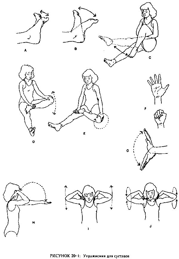 4. Оставаясь в том же положении, сгибайте и выпрямляйте суставы лодыжек. Повторите десять раз. (Рис. 20-1 В). 5. Теперь немного раздвиньте ноги. Не отрывая пяток от пола, делайте круговые вращения стопами по десять раз в каждом направлении. 6. Сохраняя исходное положение, согните правую ногу и поднимите ее как можно выше, потянув пятку к правой ягодице. Затем выпрямите ногу, не касаясь ступней пола. Повторите десять раз и продолжайте то же самое с левой ногой. (Рис. 20-1 С). 7. Сидя в том же положении, обеими руками обхватите бедро возле туловища. Вращайте ногой от колена десять раз по часовой стрелке и десять раз против. То же самое повторите с левой ногой. 8. Согните левую ногу и положите ее стопу на правое бедро. Возьмитесь левой рукой за колено, правую руку положите на лодыжку. Двигайте согнутую ногу вверх и вниз, раскрепощая ее мышцы. Повторите то же самое с правой ногой. (Рис. 20-1 D). 9. Оставаясь в том же положении (п.8), вращайте правое колено от бедра десять раз по часовой стрелке и десять - против. Повторите с левой ногой. (Рис. 20-1 Е). 10. Сидя в исходном положении с вытянутыми ногами, вытяните руки вперед на высоте плеч. Сгибайте и распрямляйте пальцы обеих рук. Крепко сжимайте в кулаках большие пальцы рук. Повторите десять раз. (Рис. 20-1 F). 11. Сохраняя предыдущее исходное положение, сгибайте вверх и вниз кисти. Повторите десять раз. (Рис. 20-1 G). 12. В том же положении вращайте кистями десять раз по часовой стрелке и десять против. 13. Находясь в том же исходном положении (п. 10), вытяните руки вперед ладонями вверх. Сгибайте руки в локтях, касаясь плеч кончиками пальцев и снова выпрямляйте руки. Повторите десять раз и проделайте то же самое, вытянув руки в стороны. (Рис. 20-1 Н). 14. Не отрывая пальцев от плеч, поднимайте локти как можно выше. Затем опускайте их. Повторите. (Рис. 20-11). 15. Из исходного положения п. 14 совершайте круговые вращения локтями - десять раз вперед и десять назад. Делайте круги как можно шире, соединяя локти перед грудью. (Рис. 20-1 J). Освоив эти упражнения, вы сможете одновременно работать с пальцами рук и ног, со стопами и кистями. 16. Теперь выполните несколько приседаний, делая выдох на каждом из них. Начните, по крайней мере, с десяти приседаний, постепенно доводя их число до двадцати. 17. Наклонитесь и, не сгибая колен, коснитесь руками пальцев ног. Повторите десять раз. Затем наклонитесь и, не сгибая колен, держитесь руками за пальцы ног в течение трех минут. 18. Раздвиньте ноги как можно шире и повторите предыдущее упражнение, сначала наклоняясь к левой ноге, затем к правой. Потом наклонитесь прямо перед собой и сохраняйте такое положение в течение трех минут. 19. Вращения шеи и головы. Нагибайте голову вперед и назад. Повторите десять раз. Теперь поворачивайте голову в стороны. Вращайте головой по часовой стрелке и затем в другую сторону, пока не почувствуете раскрепощение мышц шеи. 20. Встаньте. Поставьте ноги немного шире плеч. Сгибайте корпус наклоном влево, правая рука над головой. Повторите несколько раз. Теперь наклоняйтесь вправо, помогая себе левой рукой.