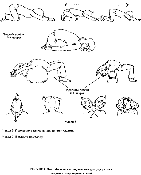 Чакра 1. Широко расставьте ноги, ступни немного раздвиньте в стороны. Теперь, сгибая ноги в коленях, приседайте как можно глубже, стараясь, чтобы ягодицы опускались до уровня колен. Повторите несколько раз. Теперь добавьте к приседаниям движения тазом, перемещая его вперед и назад. Акцентируйте движение вперед. На каждое приседание — три таких покачивания. Сделайте еще три покачивания вперед и назад, оставаясь на согнутых коленях; затем — то же самое, выпрямляя колени. Повторите все упражнение трижды. Чакра 2. Ноги на ширине плеч, ступни параллельны друг другу. Покачивайте тазом вперед и назад, слегка сгибая колени. Повторите несколько раз. Теперь представьте себя находящимся внутри цилиндра, который необходимо отполировать. Полируйте его бедрами. Затем, положив руки на бедра, делайте круговые вращения тазом для того, чтобы ровно отполировать все стороны цилиндра. Чакра 3. Прыжки. Выполняются в паре. Возьмитесь крепко за руки. Один из вас поддерживает, другой прыгает. В прыжке подтягивайте колени как можно ближе к груди. Прыгайте несколько минут не останавливаясь. Отдохните стоя, не сгибайте туловища. Поменяйтесь ролями. Чакра 4. Это изометрическое упражнение. Встаньте на колени, положив руки на пол, как показано на рис. 20-2. Опираясь на руки сгибайте колени, пока не ощутите напряжение между лопатками (мужчины с большими мускулами могут почувствовать напряжение главным образом в плечах, им следует быть осторожными). Ощутив напряжение между лопатками, окажите изометрическое давление на эту область, с помощью ног перемещая все тело вперед и назад. Это упражнение воздействует на обратную сторону сердечной чакры, на волевой центр. Для работы с сердечной чакрой найдите что-нибудь большое и круглое — наподобие бочонка, мягкого валика кушетки или биоэнергетического стула. Лягте на него спиной, твердо опершись на ноги. Расслабьтесь и позвольте грудным мускулам распрямиться. Чакра 5. Вращения головы и шеи. Двигайте головой вверх - вниз, влево - вправо. Поднимайте ее с наклоном влево, опускайте с наклоном вправо и наоборот. Затем проделайте несколько круговых вращении головой в обе стороны. Горловая чакра очень хорошо откликается на звук. Пойте! Если не можете петь, произносите любые приятные для вас звуки. Чакра 6. Повторите упражнение 5 для глаз. Чакра 7. Правой рукой массируйте макушку головы в направлении по часовой стрелке.