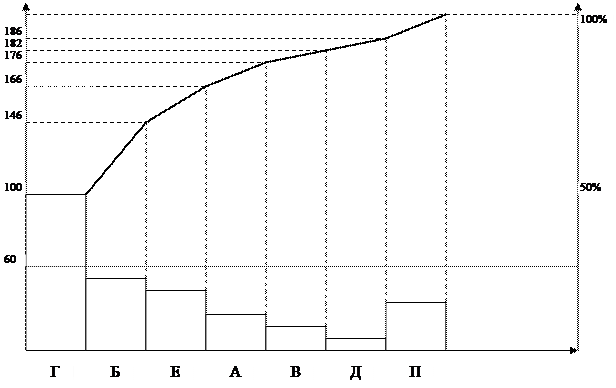 Левая ось: нанести на эту ось шкалу с интервалами от 0 до числа, соответствующего общему итогу. Правая ось: нанести на эту ось шкалу с интервалами от 0 до 100%. Горизонтальная ось: разделить эту ось на интервалы в соответствии с числом контролируемых признаков, включая группу «Прочие». Построить столбиковую диаграмму (гистограмму). Начертить кумулятивную кривую (кривая Паретто). Для этого на вертикалях, соответствующих правым концам каждого интервала, нанести точки накопленных сумм.