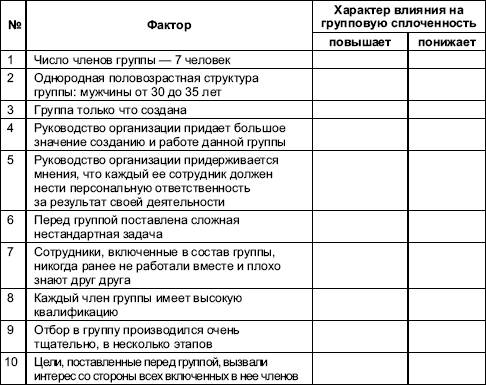 Важной интегральной характеристикой группы выступает сплоченность. Она оказывает большое воздействие на индивидуальное поведение, результаты работы группы и, в конечном счете, организации в целом. Поэтому крайне важно знать определяющие ее факторы и характер их влияния. Это позволит менеджерам повышать или понижать групповую сплоченность, добиваясь тех целей, которых они хотят достичь. Цель. Приобрести навыки анализа факторов, влияющих на групповую сплоченность. Задание. Проанализируйте предложенные в табл. 4.4 факторы. Определите характер влияния отдельных факторов на групповую сплоченность, заполнив соответствующие столбцы таблицы. Таблица 4.4. Факторы, влияющие на групповую сплоченность