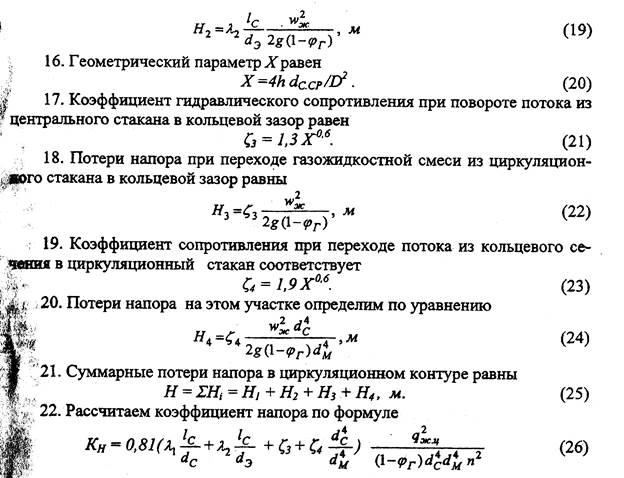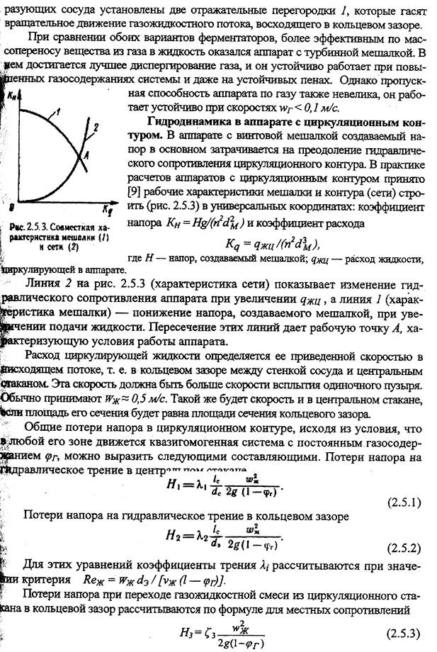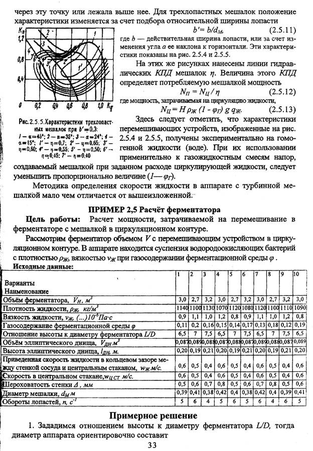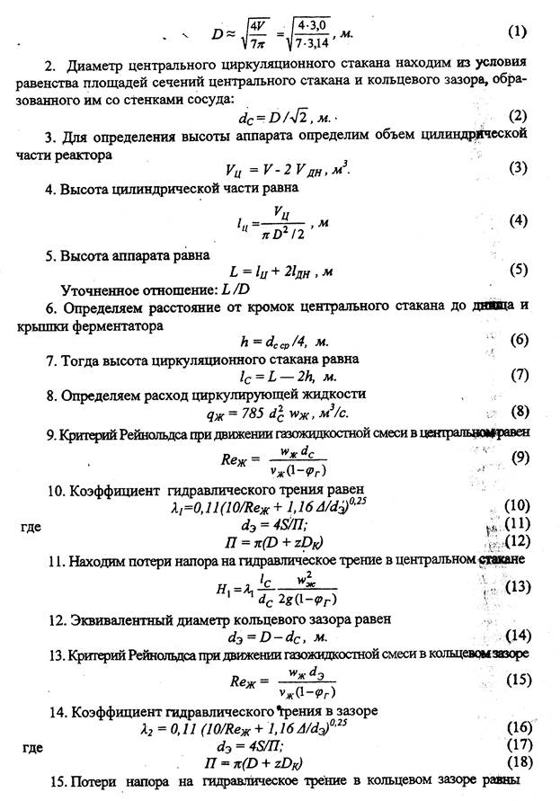 Практическая работа №5 Определение количества воздуха подаваемый с шахтный аэратор ферментатора Теоритические сведения Больший интерес для многотоннажных производств представляют струйныерментаторы. Принципиальная схема такого аппарата показана на рис. 2.6.1. Он состоит из емкости 1, циркуляционного насоса 2, теплообменных элементов 3 и 4 и аэрационного шахтного устройства 6 для пленочно-струйного истечения жидкости. Шахтное устройство является основным элементом аппарата, определяющим условия аэрирования жидкости. Принцип его работы сводится к следующему. Жидкость, увлекаемая насосом 2 из емкости 1, после теплообменника 3 подается в распределительную коробку 5 и, обтекая верхнюю закругленную кромку трубы 7, поступает в нее в виде кольцевого потока достаточно большой толщины. Стекая вниз по трубе 5 с нарастающей скоростью, жидкость увлекает за собой газ. Эффективному захвату газа спсобствуют два фактора: шероховатость поверхности раздела фаз и касательное напряжение на границе раздела газ- жидкость. По мере стекания жидкости она так насыщается газом, что в нижнем сечении трубы 6 образуется газожидкостная смесь. При падении ее с большой скоростью на поверхность жидкости, находящейся в емкости 1, происходит дополнительный захват газа, в верхней части емкости 1 образуется газожидкостная система, размеры пузырьков в которой составляют менее 3 мм. Производительность насоса 2 подбирается такой, чтобы истинная скорость направленного вниз движения жидкости в емкости 1 была выше скорости всплытия газового пузыря. При этом условии весь объем 1 будет заполнен газожидкостной смесью. В связи с этим к насосу 2 предъявляются особые требования: он должен перекачивать газожидкостную смесь с плотностью р см=400-:-500 кг / м 3. Насос имеет трехступенчатый ротор. Первая ступень работает по принципу осевого насоса; ее роль сводится к подаче пены в основную - вторую ступень. Вторая ступень центробежного типа обеспечивает необходимое давление нагнетания и в ней же происходит частичное выделение газа из жидкости. Дополнительная сепарация газа осуществляется в третьей ступени также центробежного типа. В целом в насосе сепарируется до 30% газа, поступающего в него с газожидкостной смесью. Это увеличивает до 75% КПД насоса и одновременно обеспечивает отвод углекислого газа из циркулирующей культуральной среды. Основным узлом ферментатора, обеспечивающим ввод воздуха в культуральную среду, является аэрирующее шахтное устройство. При оценке количества засасываемого в него воздуха можно исходить из следующих предпосылок. Жидкость течет по трубе 6 турбулизованным кольцевым потоком с постоянной по всему его сечению скоростью wж. Исключение составляет только тонкий пристенный слой, где происходит уменьшение этой скорости до нуля. Засасываемый газ внутри кольцевого потока сильно турбулизован, так что средняя его скорость wГ = wГ.ГР / k2 = wЖ / k2, где k2 – коэффициент пропорциональности, определенный по формуле k2 =1,64/Re H0.026; wГ.ГР - скорость газа на границе раздела фаз. При этих допущениях расход увлекаемого жидкостью газа будет qГ = π d2Г wЖ / (4k2), где dГ - диаметр сечения газового потока (см. рис. 17). Если допустить, что скорость течения жидкости не изменяется существенно по высоте трубы, то можно принять wЖ = (2g ∆h)1/2, где ∆h – высота слоя жидкости над сливной кромкой т