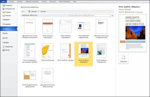 Рисунок 4. Образцы шаблонов. Мои шаблоны – набор созданных вами шаблонов. Если вы еще не создали шаблон, то после щелчка по кнопке «Мои шаблоны» появится окно «Создать». Выберите, что хотите создать – документ или шаблон (в любом случае вы можете использовать любой документ в качестве шаблона), затем внесите соответствующие изменения в документ и сохраните его. Из существующего документа – загружает документ на ваш выбор, с соответствующими настройками форматирования, что удобно использовать при работе с одним и тем же типом документов. Так вам не нужно будет постоянно форматировать документ, поскольку эти настройки уже заданы в открываемом документе. Откройте искомый документ и удалите ненужные в новом документе данные (<Ctrl+A>, затем <Delete>). Теперь можете заполнять документ новыми данными. Дополнительные шаблоны Дополнительные шаблоны или шаблоны Office.com позволяют найти практически любой шаблон, если вам недостаточно коллекции из основных шаблонов. В окне предварительного просмотра вы можете видеть, как выглядит определенный шаблон. Выбрав понравившийся, щелкните по нему (в окне шаблоны Office.com), вслед за этим произойдет его загрузка с сайта Office.com, и он автоматически откроется в новом окне. Если шаблон оказался полезным, сохраните его (<Shift+F12>). После этого вы сможете его использовать, загружая с вашего жесткого диска.
