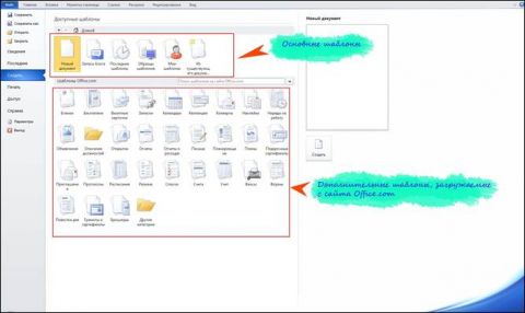 Рисунок 4. Образцы шаблонов. Мои шаблоны – набор созданных вами шаблонов. Если вы еще не создали шаблон, то после щелчка по кнопке «Мои шаблоны» появится окно «Создать». Выберите, что хотите создать – документ или шаблон (в любом случае вы можете использовать любой документ в качестве шаблона), затем внесите соответствующие изменения в документ и сохраните его. Из существующего документа – загружает документ на ваш выбор, с соответствующими настройками форматирования, что удобно использовать при работе с одним и тем же типом документов. Так вам не нужно будет постоянно форматировать документ, поскольку эти настройки уже заданы в открываемом документе. Откройте искомый документ и удалите ненужные в новом документе данные (<Ctrl+A>, затем <Delete>). Теперь можете заполнять документ новыми данными. Дополнительные шаблоны Дополнительные шаблоны или шаблоны Office.com позволяют найти практически любой шаблон, если вам недостаточно коллекции из основных шаблонов. В окне предварительного просмотра вы можете видеть, как выглядит определенный шаблон. Выбрав понравившийся, щелкните по нему (в окне шаблоны Office.com), вслед за этим произойдет его загрузка с сайта Office.com, и он автоматически откроется в новом окне. Если шаблон оказался полезным, сохраните его (<Shift+F12>). После этого вы сможете его использовать, загружая с вашего жесткого диска.