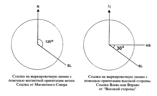 Ствол скважины является круглым отверстием, которое не может быть надлежащим образом представлено одной прямой линией. Если ее представить в виде цилиндра, то для индикации направления скважины может применяться лишь одна линия вдоль длины ствола скважины. По соглашению, эта линия представляет высокую сторону (Н.5.) ствола. При использовании отклоняющего инструмента, например, кривого переводника, для определения правильно ли сориентирован инструмент, должно быть известно положение “0” кривого переводника. Положение “0” кривого переводника может считаться измерением, указывающим, куда пойдет скважина, тогда как ранее упомянутое измерение высокой стороны есть не что иное, как азимут ствола скважины. При использовании кривого переводника/или отклонителя, переводник(и) будут иметь маркировочную метку, вытравленную или вырезанную на вершине изгиба. Ориентация маркировочной метки - это угловое положение кривого переводника (или корпуса) относительно ствола скважины. Измерительный инструмент (телесистема и т.д.) не может быть непосредственно связан с маркировочной меткой изогнутого элемента. Поскольку измерительные инструменты привинчиваются к кривому переводнику, и поскольку резьбовое соединение редко собирается так, чтобы совпали маркировочные метки на двух инструментах, на измерительном инструменте должна быть собственная маркировочная метка. Хотя возможно собрать забойную компоновку (ВНА) так, чтобы маркировочные метки измерительного прибора и кривого переводника в точности совпадали, на практике это встречается очень редко.