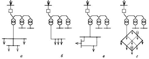 Рис. 4.4. Основные виды структур СЭС: а – радиальная сеть; б – магистральная сеть; в – кольцевая (замкнутая) сеть; г – петлевая сеть