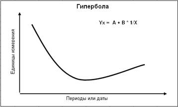Тенденция к спаду динамики экономического процесса с нарастающим замедлением к концу периода, хорошо отображается функцией гиперболы: Yx = A + В * 1/Х (2.6) Графическая форма модели гиперболического тренда приведена на рис. 2.7. Трендовые модели используются также для краткосрочных прогнозов, когда есть вероятность инерционного развития рынка. При этом, исходят из того, что сложившиеся в прошлом тенденции при соответствующих условиях можно распространить (экстраполировать) на прогнозируемый период. В формулу уравнения подставляется номер последующего прогнозируемого периода. Для долгосрочного периода, когда существенно меняются рыночные условия и окружающая среда, этот метод мало подходит. Кроме того, дополнительные сложности возникают, когда необходимо учитывать сезонность. Несколько позже будет рассмотрена данная проблема.