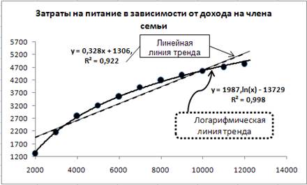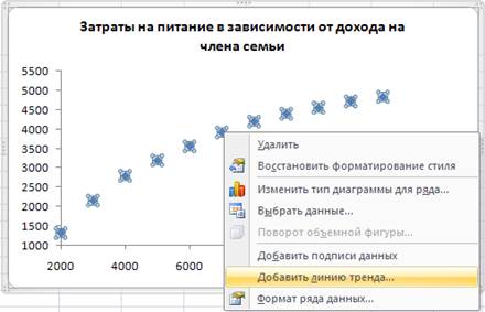 Построение линии тренда расходов на продукты питания в зависимости от уровня дохода семьи