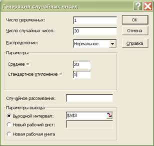 Рис. 2. 18. Задание параметров для генерации случайных чисел для равномерного распределения · В поле Число переменных введите 1 (равное количеству столбцов, которые будут заполнены последовательностью). · В поле Число случайных чисел введите 30, что соответствует периоду в один месяц. · В поля Между и введите интервал распределения количества заказов в день =10 и 30. · Если достаточно одной последовательности, то поле Случайное рассеивание оставьте пустым. · В полях группы Параметры вывода щелкните на Выходной интервал и укажите ссылку на первую ячейку диапазона вывода данных - А3. · Нажмите кнопку ОК. · Полученные данные округлите до целых чисел. Excel создаст в столбце последовательность случайных чисел. Как на ее основе построить гистограмму и получить таблицу частот рассмотрим далее. Присвойте листу имя Равном распред. Другие распределения, возможно, будут лучше моделировать реальную ситуацию. Очень многие модели, построенные с помощью нормального распределения, хорошо соответствуют действительности. Чтобы построить последовательность значений нормально распределенной случайной величины, необходимо задать математическое ожидание (Среднее, например, =20) и дисперсию (Стандартное отклонение, например, = 5). · Переименуйте имеющийся или создайте новый рабочий лист и присвойте ему имя Норм распред. Далее выполните операции как для равномерного распределения (рис. 2.16).