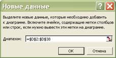 Таким образом, вы подготовили наш рабочий лист к использованию программы "Поиск решения". Для того, чтобы получить оптимальное (наилучшее) приближение к нашей функции необходимо найти минимальное значение целевой функции ячейки G39 {=СУММ (Е3:E38)} / min, (или ячейки M2 {=СУММКВРАЗН(C3:C38;D3:D38) / min}) изменяя значения коэффициентов - ячейки A, B, C (H3:J3). F Внимание. Обратите внимание, что записанная нами функция аппроксимации содержит нелинейный член (Sin(X)). Функции такого типа могут иметь не одно, а несколько решений, различающихся своими значениями[7]. Для решения подобных задач, необходимо указать область решения. Это может быть сделано, задавая различные ограничения в диалоговом окне «Поиск решения». Однако, это достаточно сложная и трудоемкая задача определения граничных условий решения. Найти необходимую область решения задачи можно, следуя следующему алгоритму: · Введите в построенную диаграмму данные уравнения прогноза. В нашем случае это ячейки D3:D38. Для этого: · Выделите диаграмму. · Выделите команду Диаграмма / Добавить данные. · В открывшееся диалоговое окно Новые данные (рис. 2.35) введите диапазон ячеек $D$2:$D$38.