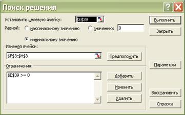 Рис. 2. 40. Диалоговое окно процедуры Поиск решения · В окне "Изменяя ячейки" укажите адреса изменяемых ячеек (коэффициентов уравнения) - $H$3:$J$3. · В окне "Ограничения" (рис. 2.38) укажите, что значение ячейки $G$39 должно быть больше нуля.
