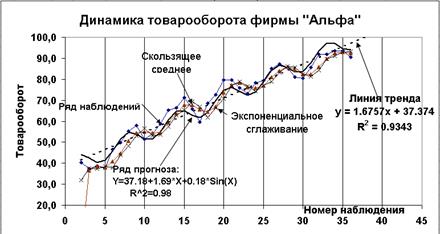 Полученное уравнение имеет не только более высокую степень аппроксимации (см. рис. 2.34 B 2.40), но и позволяет проанализировать влияние периодической составляющей. (В нашем примере, частичное увеличение спроса ожидается в осенние месяцы). Дальнейший анализ влияния периодической составляющей на величину объема продаж может быть направлен на оценку величины увеличения (уменьшения) объемов продаж, вызванной этой компонентой. Проведение такого анализа не вызывает особых затруднений и может быть легко выполнено вами самостоятельно. · Добавьте в диаграмму линии, полученные при определении Скользящего среднего и Экспоненциального сглаживания. Результат приведен на рис 2.40.