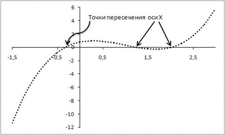 Рис. 6. 10. График функции На диаграмме вы видите, что график пересекает ось Х приблизительно в точках –0,3; 1,2; 2. Для того чтобы определить точные значения воспользуйтесь процедурой Подбора параметра. В интервале значений Х от – 0,5 до – 0,25 Y переходит через нулевое значение. - Курсор установите в ячейку Y26, так как там значение Y находится ближе к нулю. - Выберите команду Подбор параметра (рис. 6.6). - В поле «Установить в ячейке» появившегося окна (рис. 6.11) введите ссылку на ячейку В26, содержащую формулу;